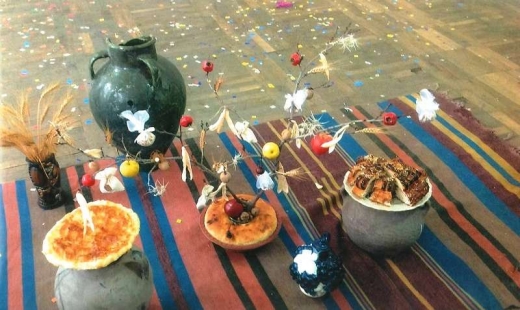 Սեղաններն էլ առատ էին ավանդական ծիսական ուտեստներով՝ Տարեհաց, գաթա, հատիկեղեն, յոթ տեսակի մրգեր, չիր ու չամիչ... Ավանդական տոնածառի կողքին էր նաև Մոմերի ծառը, որի վրա մոմեր էին դնում և ընտանիքի յուրաքանչյուր անդամ իր համար մոմ էր վառում, նաև Կենաց ծառը, որը զարդարված էր հասկերով՝ ի նշան առատության, խնձորով, որը խորհրդանշում է պտղաբերություն, լոբու պատիճներով, որոնք խորհրդանշում են ընտանիքի ամրությունը, փշերով՝ ուղղված չարի դեմ, փոքրիկ քսակներով՝ որպես առատության և լիության խորհրդանիշ: