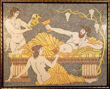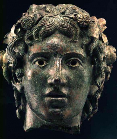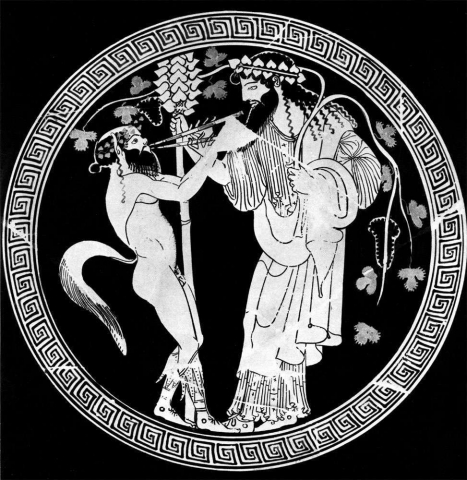 Դիոնիսոսը Զևսի և Սեմելեի որդին է: Հաճախ պատկերվում էր խրախճասեր ու կենսուրախ շքախումբի ուղեկցությամբ, որի մեջ էին մտնում ծեր սիլենները, երիտասարդ սատիրները, ինչպես նաև Բաքոսի մոլեգին սպասուհիները`   կին մենադները: Դիոնիսոսին հատկապես հարգում էին գյուղական վայրերում: