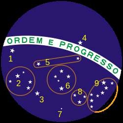 Պետական դրոշների և խորհրդանիշների մեկնաբանման բազմաթիվ տարբերակներ և կարծիքներ  գոյություն ունեն: Համաձայն դրանցից մեկի՝ կանաչն ընդարձակ ջունգլիներն են, դեղին շեղանկյունը՝ հանքանյութերի և ոսկու հարստությունը: Խորհրդանշանի վրա Հարավային կիսագնդի երկինքն է և Հարավային խաչ համաստեղությունը: «Ordem e Progresso»կարգախոսը թարգմանաբար նշանակում է՝ «Կարգապահություն և առաջընթաց»: